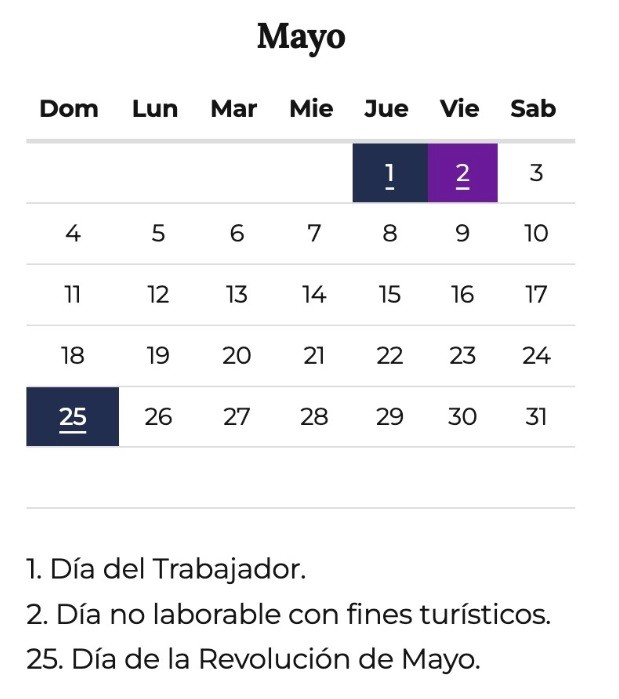 De acuerdo con el calendario oficial de feriados de 2025 aprobado por el Gobierno Nacional, el viernes 2 de mayo es un “Día no laborable con fines turísticos”, por ello, no se trata específicamente un feriado obligatorio.