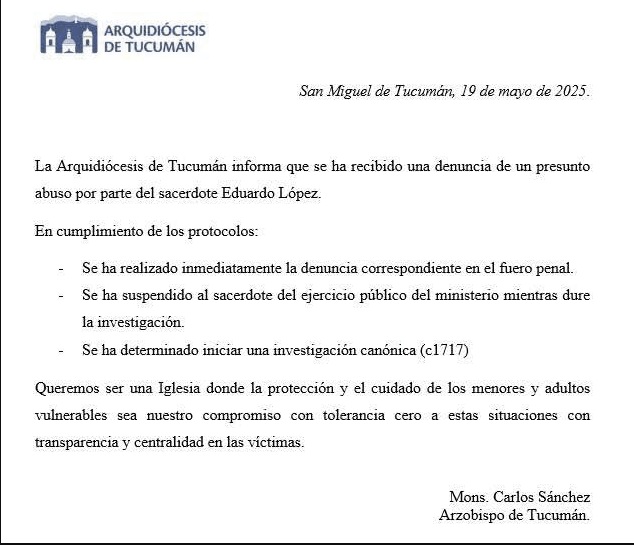 La Arquidiócesis de Tucumán informó oficialmente este lunes que recibió una denuncia por un presunto caso de abuso cometido por el sacerdote Eduardo López. La acusación, según precisaron en un comunicado, fue canalizada a través del fuero penal y también derivó en una investigación interna en la Iglesia.