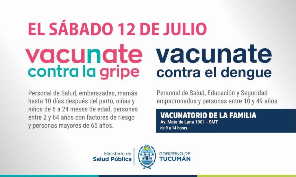 Este sábado 12 de julio, el Ministerio de Salud Pública de Tucumán llevará adelante una nueva jornada de vacunación gratuita destinada a prevenir dos enfermedades estacionales: la gripe y el dengue.